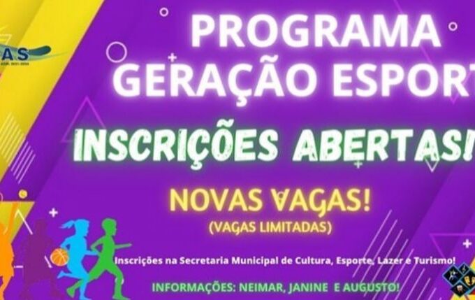 ByMunicípio de Datasfevereiro 6, 2025Novas vagas abertas para o programa ”Geração Esporte”! Podem se inscrever alunos de 06 a 14 anos, basta levar cópia da identidade de...