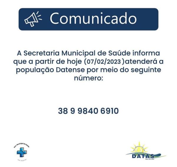 ByMunicípio de Datasabril 10, 2023A Prefeitura Municipal de Datas, por meio de sua Secretaria Municipal de Saúde, têm o prazer de convidar a toda a população datense...