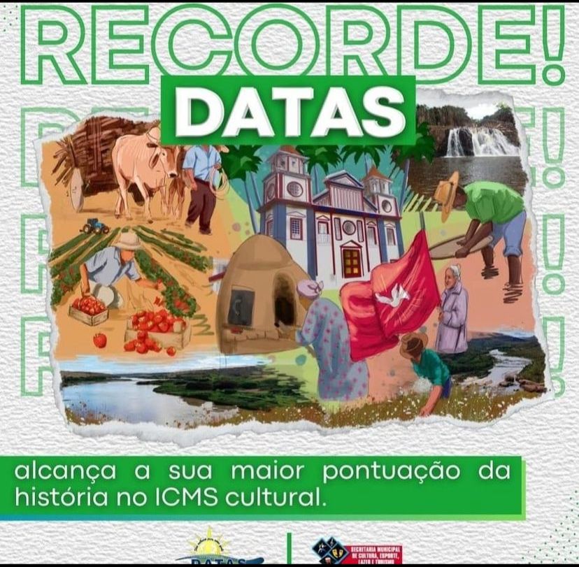 Datas bate recorde no ICMS CulturalA Prefeitura Municipal de Datas comemora mais uma importante conquista da gestão 2021/2024: a pontuação recorde no ICMS do Patrimônio Cultural. A marca alcançada neste ano 17,59 é historicamente a maior do município, despontando como destaque em toda a região.O ICMS Patrimônio Cultural é um programa de incentivo à preservação do patrimônio cultural do Estado. Ele funciona por meio de repasse dos recursos aos municípios que preservam seu patrimônio e suas referências culturais, através de políticas públicas relevantes.Com essa pontuação, o Município gera a possibilidade do recebimento de mais recursos e destaca a importância do trabalho da Secretaria de Cultura, Esporte, Lazer e Turismo de Datas por meio do Conselho Municipal do Patrimônio Cultural.A todos os envolvidos nosso reconhecimento pelo magnífico trabalho!