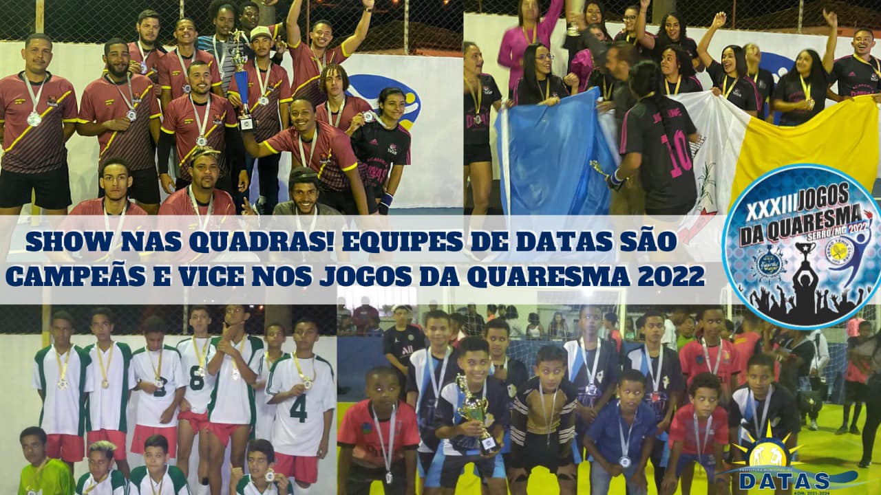 NOITE DE FESTA NA CIDADE DE SERRONo último sábado quase 80 pessoas saíram de Datas com destino a cidade de Serro, para apoiar nossas equipes nos grandes duelos pelas finais dos jogos da quaresma 2022.Os Nossos Atletas deram verdadeiro show de habilidade, competência, garra e determinação. Foram 4 finais em sequência de modalidades diferentes. No Handebol feminino nossas meninas mostraram o porque de serem um dos times mais fortes da região e levaram o título de campeãs, no masculino nossos rapazes foram superados pelo forte equipe adversária e saíram com vice campeonato. No Futsal tivemos grandes jogos, levando a torcida ao delírio, os meninos da equipe mirim foram campeões em um jogo eletrizante do início ao fim, derrotando os donos da casa! Já nossa equipe infantil que também fez um grande jogo saiu com o vice campeonato que foi motivo de muito orgulho para todos! Os Atletas Janine Pereira, Kaiky Araújo e Luiz Fernando, foram destaques da sua categoria e trouxeram para casa o troféu de artilharia da competição. Parabenizamos também a equipe de futsal masculino adulto que infelizmente não chegou as finais, mais representaram muito bem nosso município! Parabenizamos os membros das comissões técnicas pelo desempenho, esforço e dedicação à frente das equipes. Agradecemos a toda torcida que esteve presente empurrando as equipes, aos pais que confiaram e incentivaram os filhos a participarem! Aos nossos atletas nossa grande gratidão por representarem tão bem nosso município! Parabéns a todos.