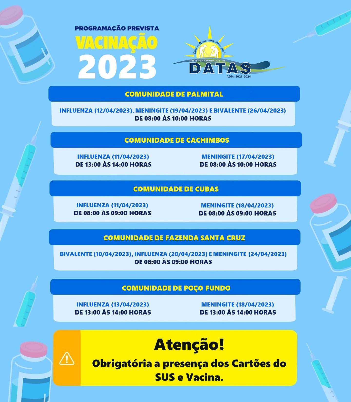 Atenção para os dias de vacinas nas comunidades rurais cadastradas na UBS de Palmital.